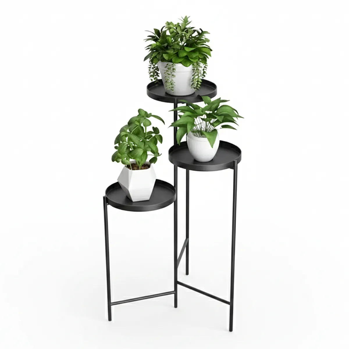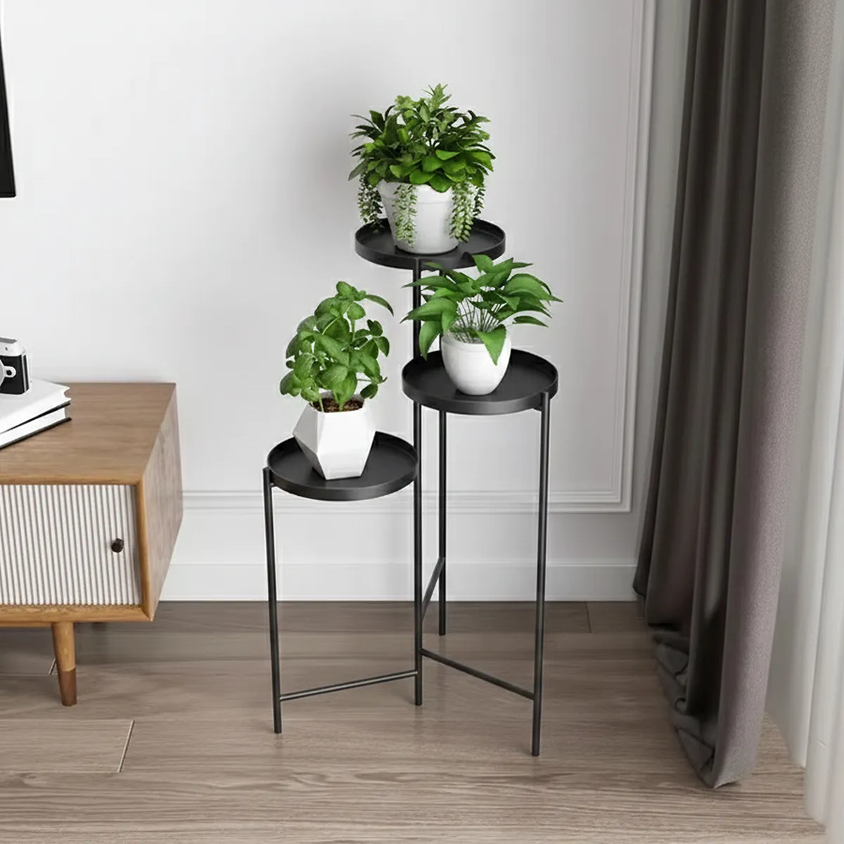 Este soporte de tres niveles es la pieza clave para quienes buscan presencia visual y optimización de espacio. Gracias a su altura de 90 cm, es ideal para destacar plantas con caída o crear rincones decorativos que capturen todas las miradas, ya sea en un living moderno o en una oficina con estilo.
