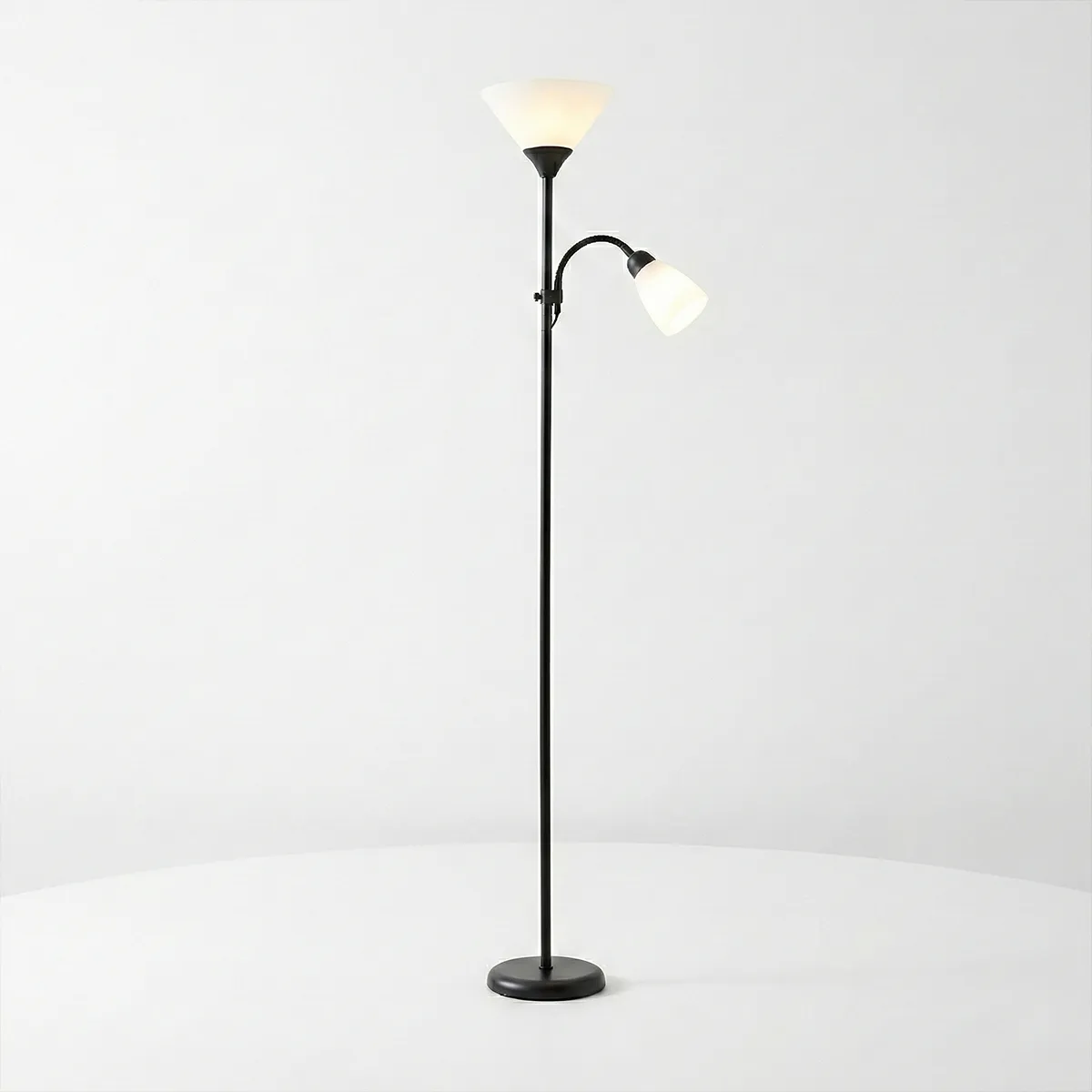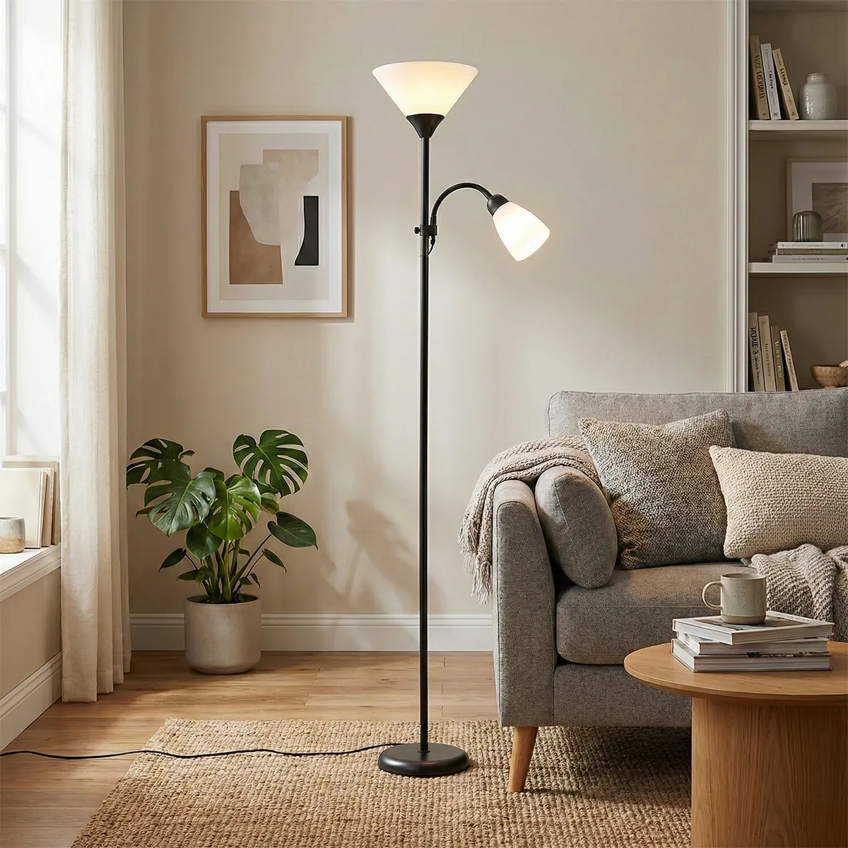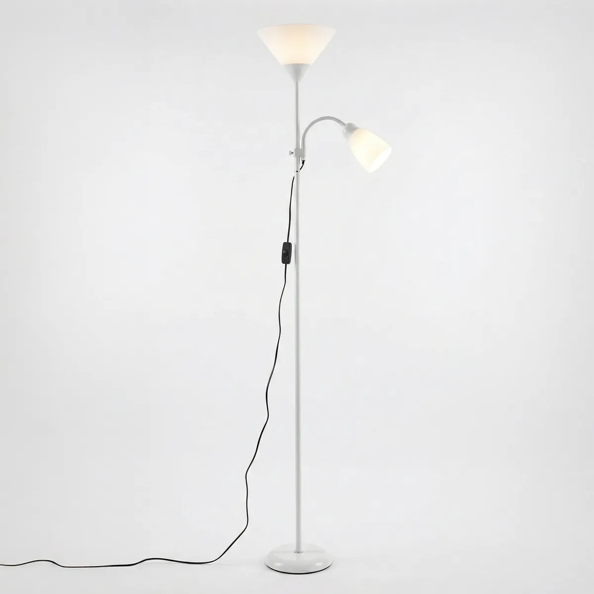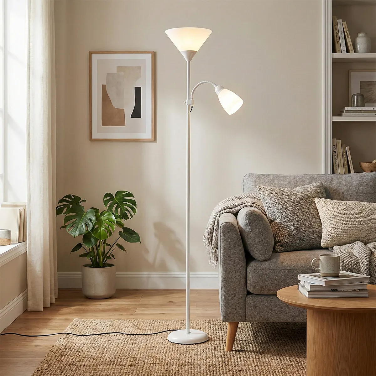La Lámpara de Pie Cala de 165 cm combina un diseño moderno con la máxima practicidad. Su estructura de doble iluminación cuenta con un portalámparas superior para ambiente y un brazo flexible ideal para lectura, permitiéndote orientar el haz de luz según lo necesites.
